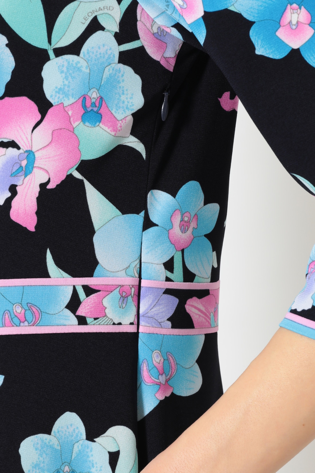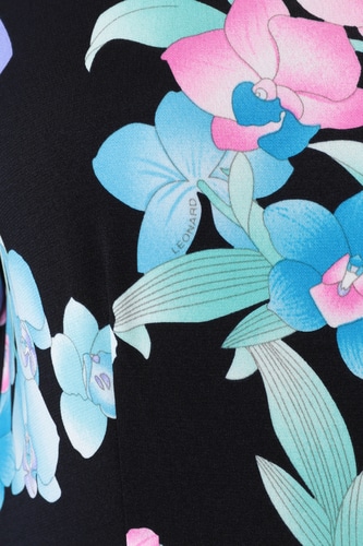 美しいフラワーモチーフプリントを配したLEONARDならではのワンピース。着用頂くだけで華やかさと特別感ある雰囲気を醸し出します。浅めのネックラインや抜け感のあるコンパクトなお袖、ミディ丈のドレープフレアが女性らしさたっぷり。配色ラインでメリハリを効かせ、スタイルアップも叶えてくれる今季おすすめのアイテムです。※バックファスナー