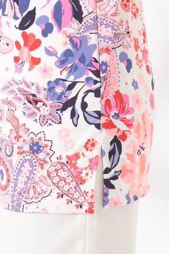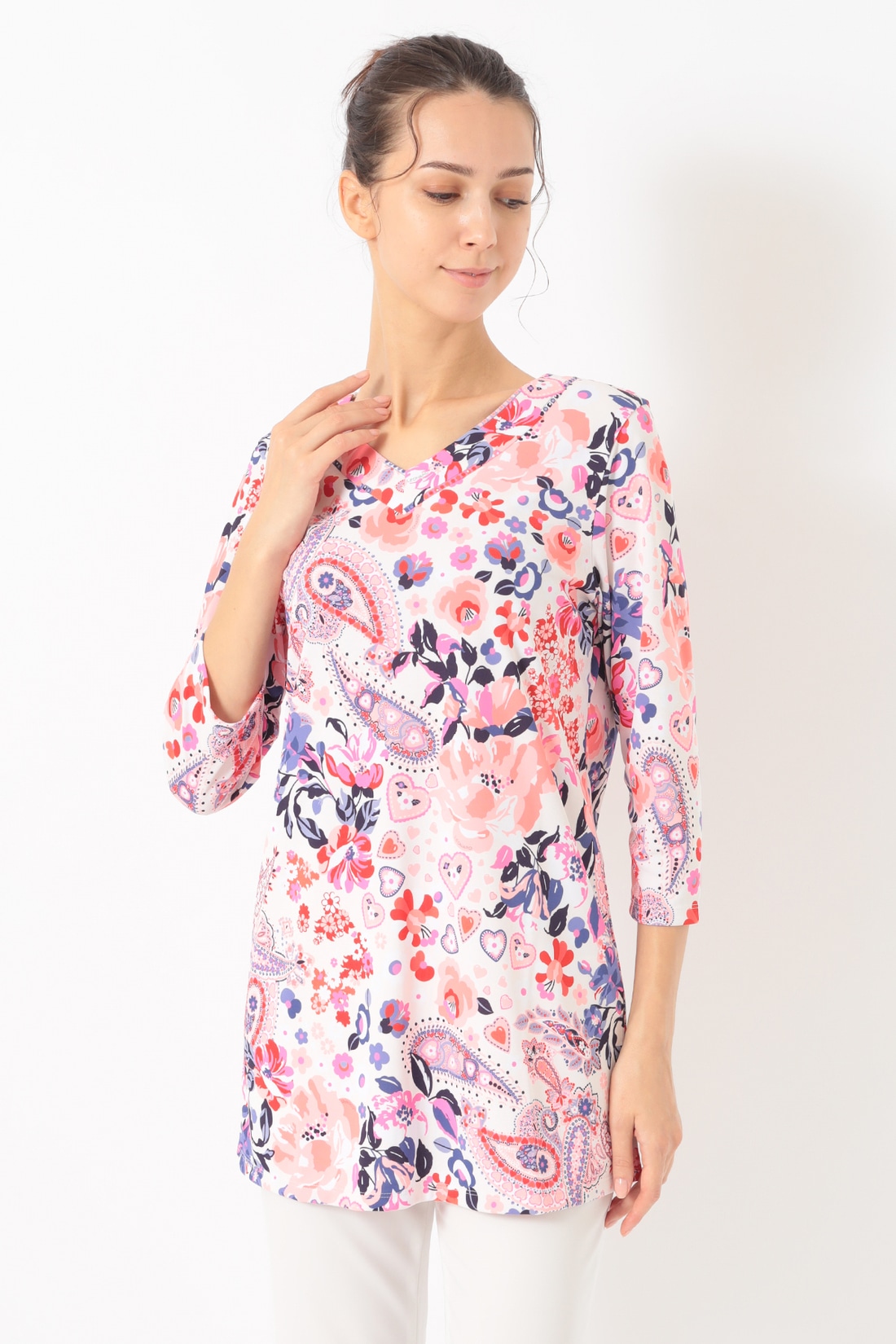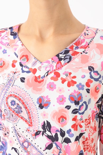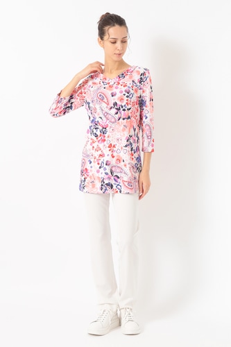 ポリエステル素材を使用した軽量でさらりと着用頂けるカットソートップ。開きすぎないVネックに腰回りまでカバーする丈感長めのチュニックシルエットがデイリーカジュアルにも最適な一枚です。サイドスリット入りの裾や七分丈のソフトな抜け感も魅力的。アクティブなシーンにも華やかさを加えてくれるおすすめのアイテムです。