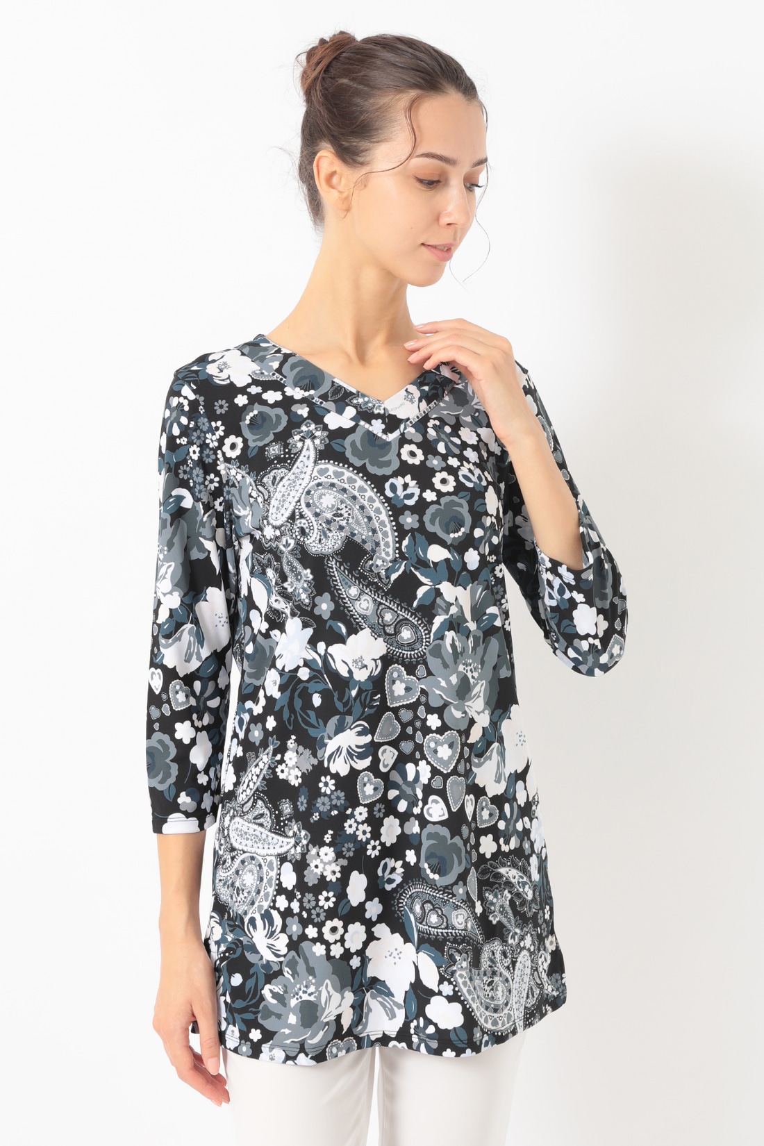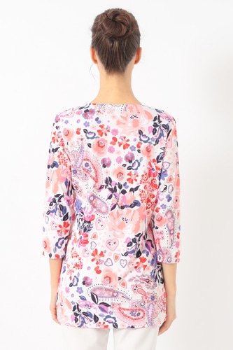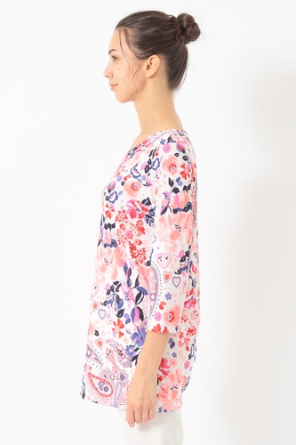 ポリエステル素材を使用した軽量でさらりと着用頂けるカットソートップ。開きすぎないVネックに腰回りまでカバーする丈感長めのチュニックシルエットがデイリーカジュアルにも最適な一枚です。サイドスリット入りの裾や七分丈のソフトな抜け感も魅力的。アクティブなシーンにも華やかさを加えてくれるおすすめのアイテムです。